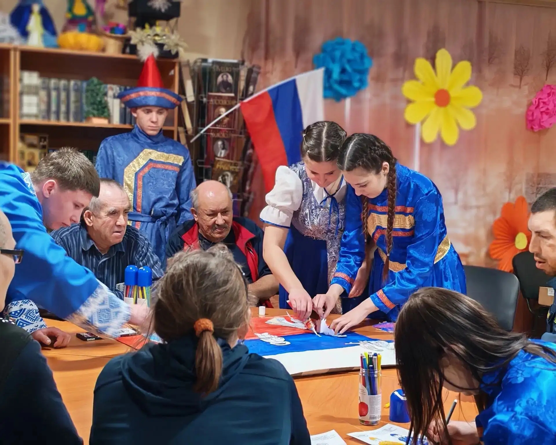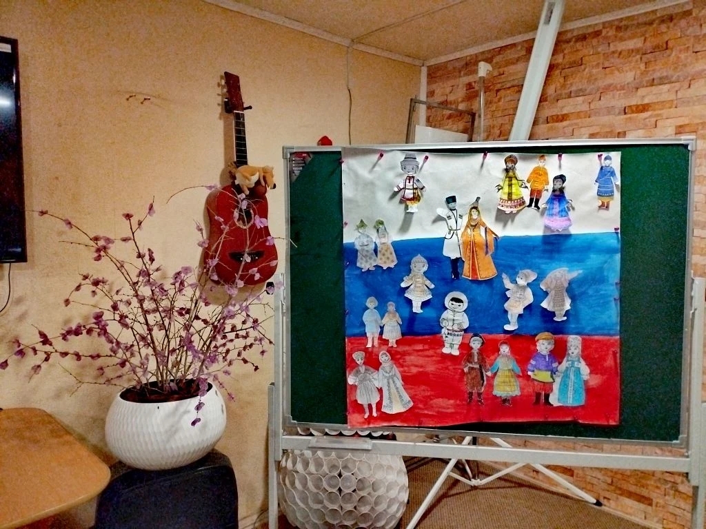 А потом началось самое веселое! Волонтеры в красивых национальных костюмах станцевали ехор – это было очень зрелищно! Затем под руководством Натальи Татаркиной все перешли к творческой части мероприятия, взялись за кисточки и карандаши: рисовали российский флаг, раскрашивали фигурки в ярких национальных нарядах. А в конце все вместе создали огромный, красивый коллаж, который стал настоящим символом дружбы. И, конечно, весь день звучали любимые песни о России – от Маршала до «Любэ», создавая очень теплую атмосферу.